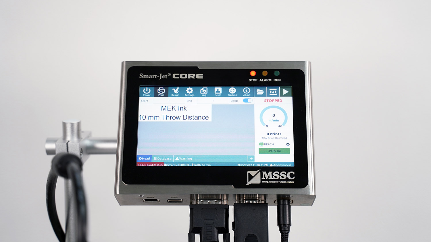 O sistema de impressão Smart-Jet® CORE permite controlar um cabeçote de impressão (CORE PRO, CORE MAX, CORE REACH) a partir de um controlador de impressão touchscreen, localizado entre 1,5 m a 5 m do cabeçote. Você também pode conectar o controlador de impressão CORE a uma rede Ethernet para acesso e controle remotos.
