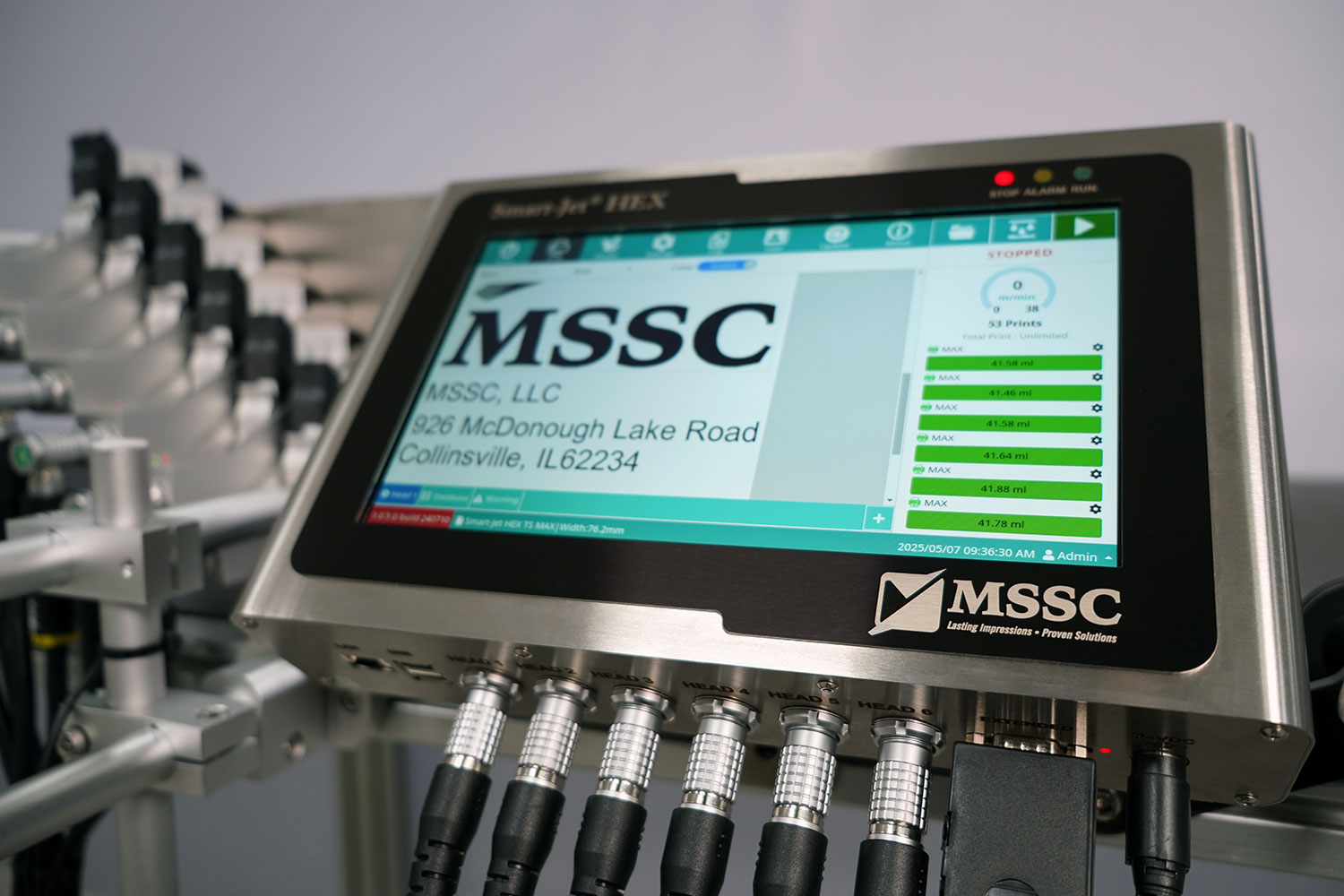 O sistema de impressão Smart-Jet® HEX permite controlar até seis (6) cabeçotes de impressão TS (Touchscreen) (PRO, MAX ou REACH) a partir de um controlador de impressão touchscreen. Você também pode conectar o controlador HEX a uma rede Ethernet para acesso e controle remotos.